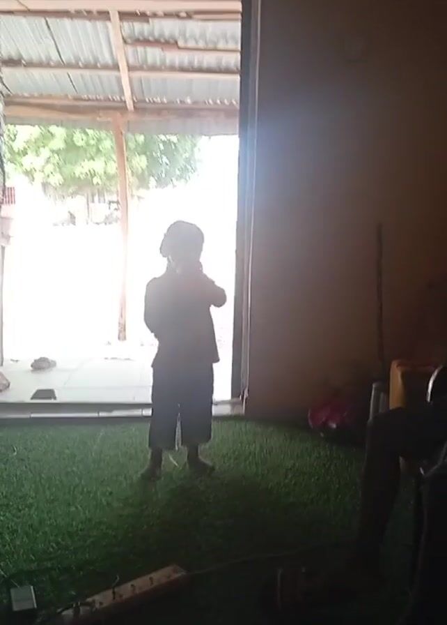 A young child is standing in a doorway. The child is silhouetted against the bright light coming through the doorway and is wearing a t-shirt and shorts. The child is barefoot and appears to be hugging their self. They are standing on a patch of artificial turf. Behind the child, outside the doorway, is an outdoor space with tile flooring and a corrugated metal roof structure. Trees and other structures are visible in the background. Inside the room, on the right side, there is a person sitting in a chair, mostly out of view, with only their legs visible. There is also an extension cord lying on the turf. The lighting inside the room is dim, contrasting with the brightness outside.