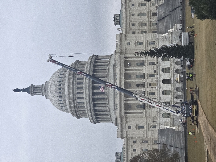 - "The U.S. Capitol Building stands prominently under a cloudy sky. A large crane, painted with red, white, and blue stripes, is positioned near the building, its arm extending towards the dome. A Christmas tree is being erected on the lawn, surrounded by workers in vests and cones. Construction or maintenance appears to be underway at the building." by FM-0HZbr1, licensed under CC BY 4.0