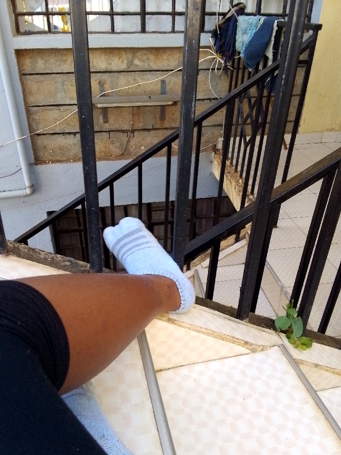 A dark-skinned leg, clad in black fabric (shorts or trousers) and a light blue sock with three horizontal grey stripes, is positioned on a light-colored, square-tiled surface featuring a subtle checkered pattern and visible grout lines. A small green plant grows from the tiled surface near the base of a black metal staircase railing, which extends downwards and to the right, indicating a multi-level structure. The background reveals a wall constructed from light brown/beige concrete blocks with horizontal indentations. Dark vertical stains or drips are visible below a mounted metallic bracket/shelf on this wall. Above the concrete blocks, a window secured with a metal grille is present. A white vertical pipe runs along the left side of the scene. Several pieces of blue and dark fabric items are draped over the upper section of the railing to the right. Thin wires or strings are also discernible in the background, adjacent to a light yellow wall section on the far right. The scene depicts an outdoor or semi-outdoor area, likely a building's landing, located in Kalimoni ward, Kenya.