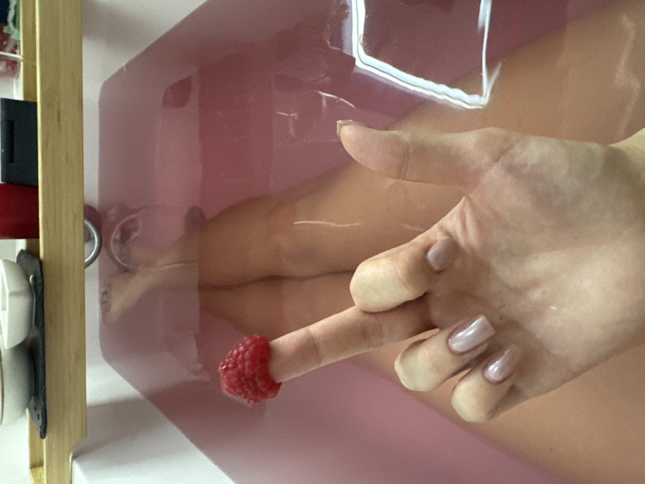 A hand extends into a pink-tinted bathtub, with a raspberry encircling one finger