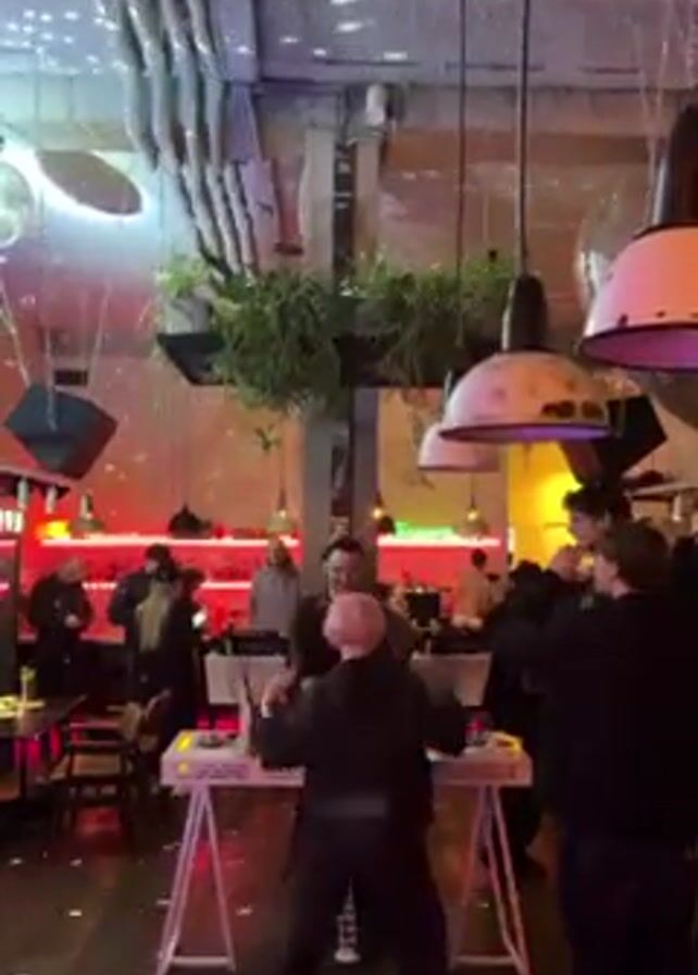 Here's a concise description of the video: A person with pink hair is DJing in a bar or club. They are wearing a black outfit and stand behind two white DJ consoles. There are several people gathered around, watching and interacting. The bar has a modern, somewhat industrial feel with exposed ductwork on the ceiling, hanging plants, and a red bar in the background. A disco ball is reflecting light onto the ceiling.