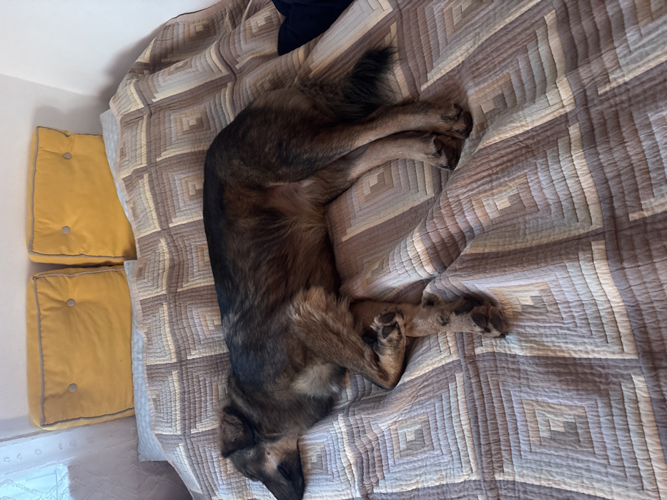 An indoor scene in Kunje, Montenegro, depicts a medium-sized dog resting on a bed