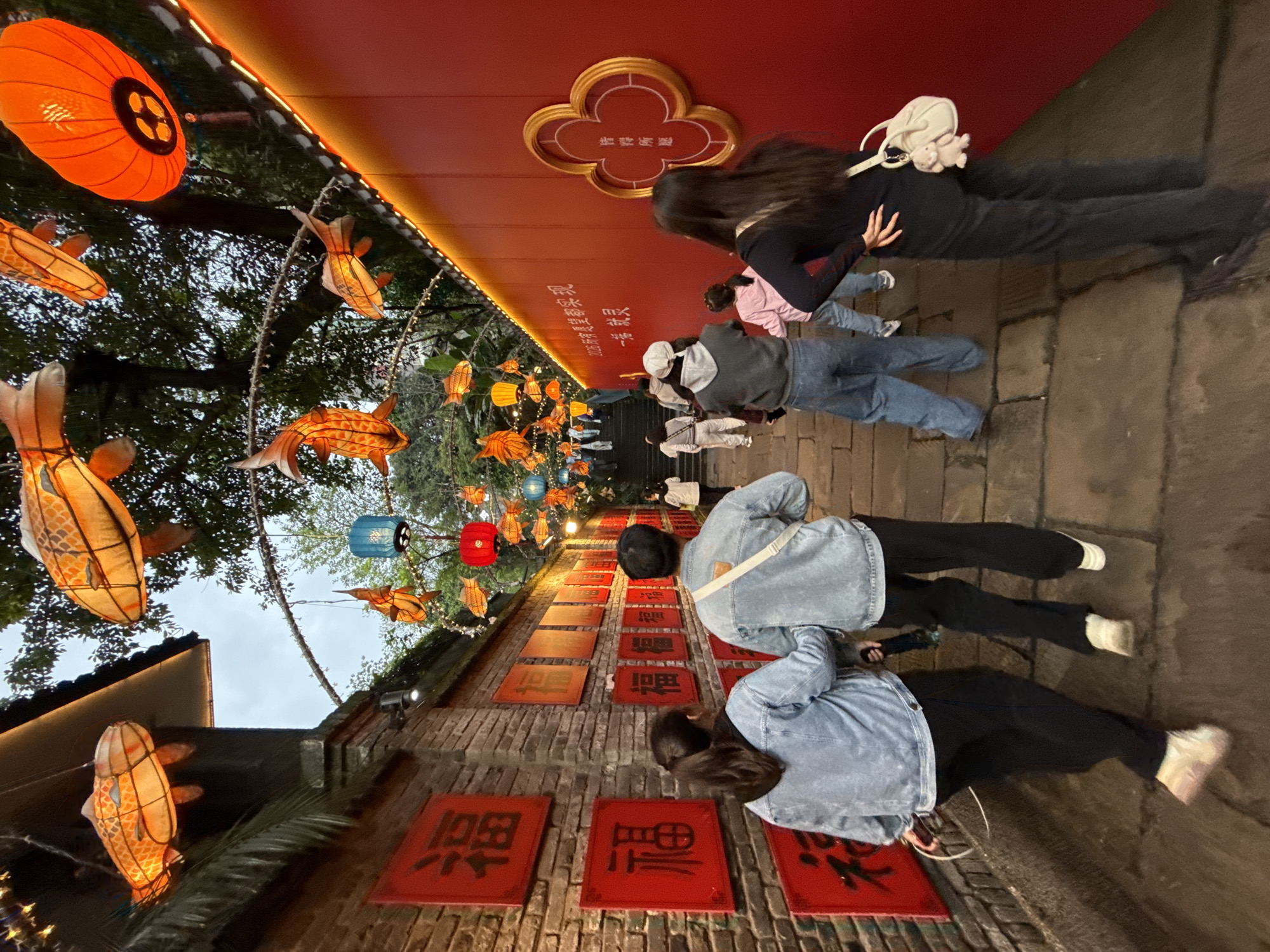 The image displays an illuminated outdoor pedestrian pathway located in Nan'an District, China, observed during dusk or early evening. Approximately 10-15 individuals, appearing as adults and children, are depicted walking away from the camera, ascending a stone-paved path that transitions into steps in the distance. The left side of the pathway is bordered by a brick wall adorned with multiple rectangular red plaques, each featuring the Chinese character "福" (Fú), signifying fortune or good luck. The right side is a solid red wall with an illuminated upper edge, displaying white Chinese text stating "2023 所有愿望都实现 一语成灵" (2023 All wishes come true, one word becomes true/spirit), and a gold quatrefoil emblem inscribed with "皆得所愿" (May all your wishes come true). Numerous lanterns are strung overhead, suspended from wires and tree branches. These include multiple illuminated orange-gold lanterns shaped like koi fish, along with traditional red and blue spherical lanterns. Green foliage is visible in the upper portions of the image, interspersed with the lighting. In the immediate foreground, a woman in a denim jacket and dark pants walks beside a man also in a denim jacket and dark pants, who carries a white sling bag. To their right, another woman in a black long-sleeved top and dark pants is visible from behind, carrying a light-colored shoulder bag with a white rabbit charm. Further up the ascending path, individuals in casual attire, including a person in a grey hoodie and a child in a pink top, are observed. The ambient light originates primarily from the decorative lanterns and overhead string lights.