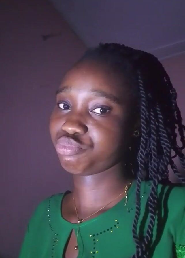 A young woman with dark skin and braided hair is centered in the frame, wearing a green blouse with decorative embellishments and a gold necklace. Her face is expressive, with lips puckered in a kissing gesture, and she looks at the camera. The background is a plain, muted purple or pink wall, with a hint of ceiling visible at the top of the frame. The lighting appears to be dim, with the woman's face illuminated by a light source in front of her. At one point, she briefly touches her neck. There's a brief audio burst, but it's difficult to discern the exact sound.