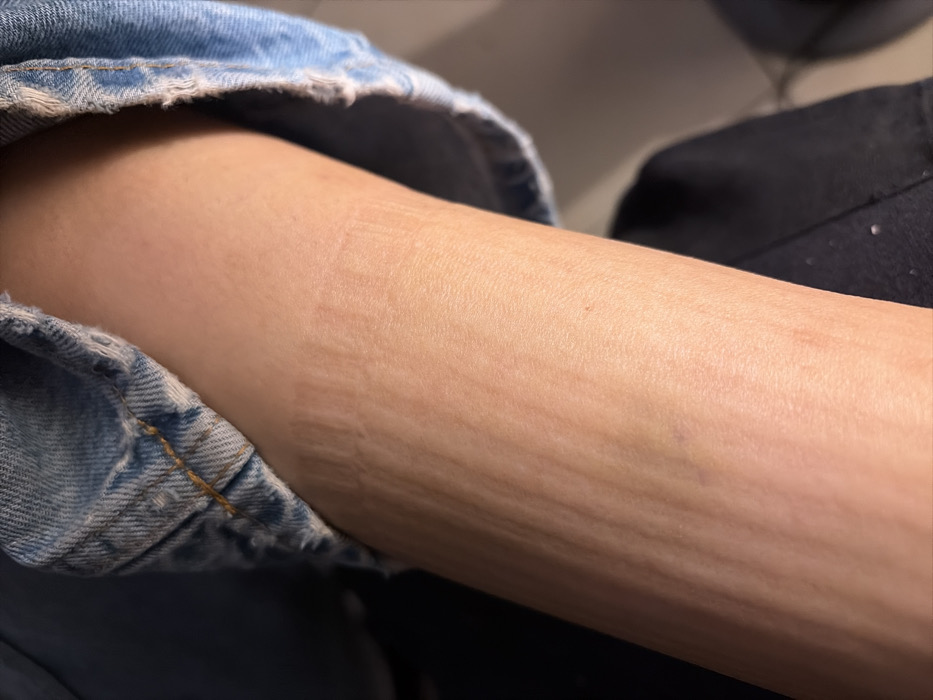 person's arm resting on a denim garment. The arm appears pale and smooth with visible skin creases and faint scars. The denim has a frayed edge with visible stitching. A portion of a dark-colored garment is also visible in the background, along with an unidentifiable gray shape. The overall lighting is soft and diffused.
