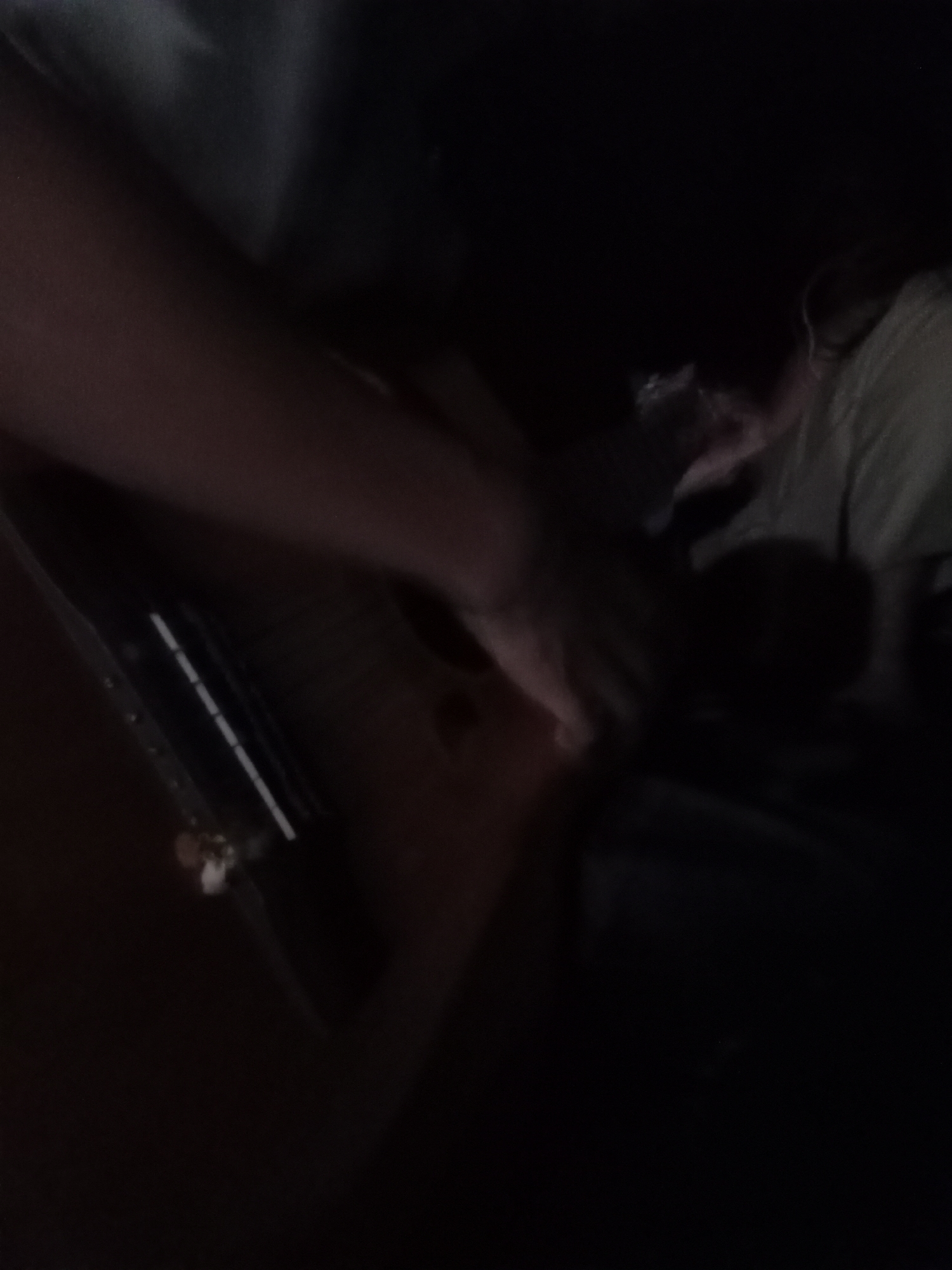 The image depicts a severely underexposed and motion-blurred interior scene, likely a confined space such as a vehicle or small room, in Unknown, Unknown. A dark-skinned forearm and hand are prominently positioned in the upper-left to mid-center, extended downwards towards the lower portion of the frame, suggesting an interaction. On the right side, a second individual is partially visible, wearing a light-colored (possibly beige or light green) short-sleeved top; their head and upper torso are indistinct due to the low light and blur. A lighter-skinned hand is also discernible in the mid-right. In the lower-left, a reflective or metallic object, possibly an interior fixture, displays faint linear highlights and small, light-colored specks. The overall scene is characterized by extreme darkness and a lack of sharp detail.