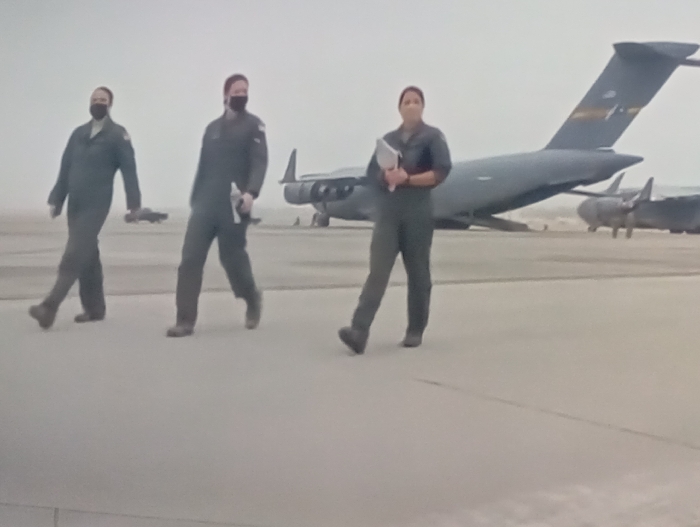 The scene depicts three individuals in dark flight suits walking from left to right across a concrete airfield tarmac