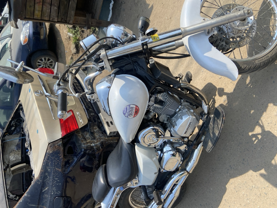This image captures an outdoor scene in Alaiyabiagba, Nigeria, featuring a white Honda "American Custom Motorcycle" positioned prominently in the foreground. The motorcycle, viewed from its front-right quarter, exhibits chrome accents on its handlebars, mirrors, dual headlights, engine casing, exhaust pipes, and wheel spokes. It has black dual seats and a front disc brake. In the immediate background, a heavily damaged black sedan is visible, missing its rear bumper and displaying significant body panel deformation and exposed frame elements. A tan or gold Lexus trunk lid, partially detached, is resting against or affixed to the rear of the black sedan. Further in the background, to the right of the damaged sedan, a blue sedan (appears to be a Toyota Corolla) is parked. Beyond these vehicles, additional indistinct vehicles are present. To the far right of the frame, a rustic, multi-toned wooden structure, possibly a stall or shed, is partially visible. The ground consists of uneven asphalt and dirt. Bright sunlight illuminates the scene, casting distinct shadows on the ground. No individuals are present or engaged in any discernible action. The scene suggests an automotive repair or salvage yard environment.