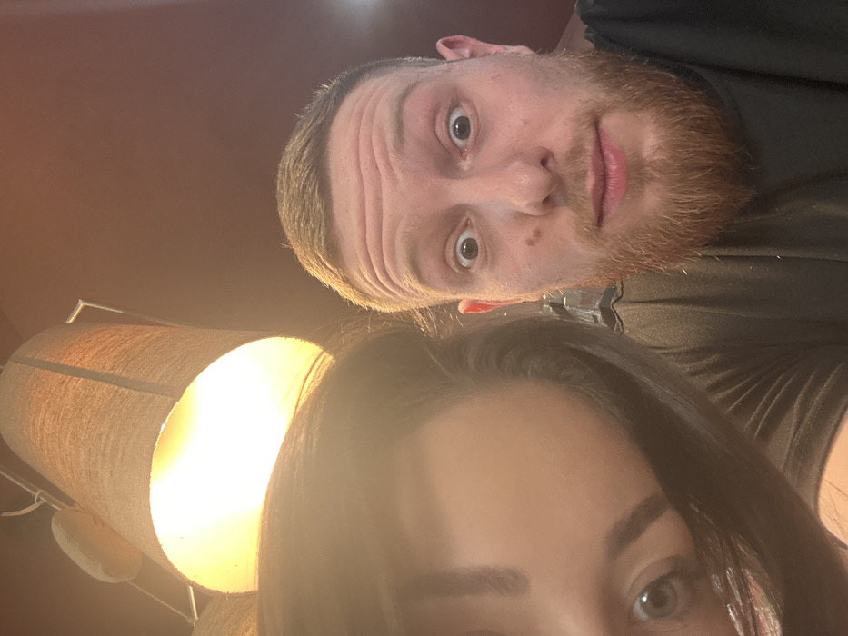 An upward-angled, close-up indoor photograph captures two individuals under artificial lighting