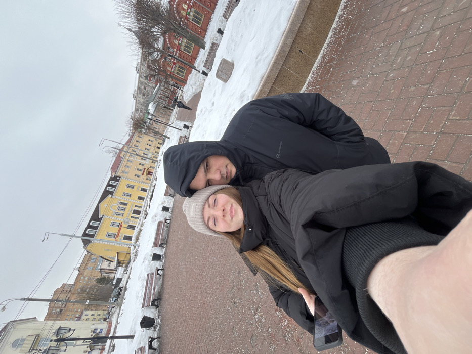 A selfie image captures a woman and a man in a snowy urban environment in Klin, Russia, under an overcast sky