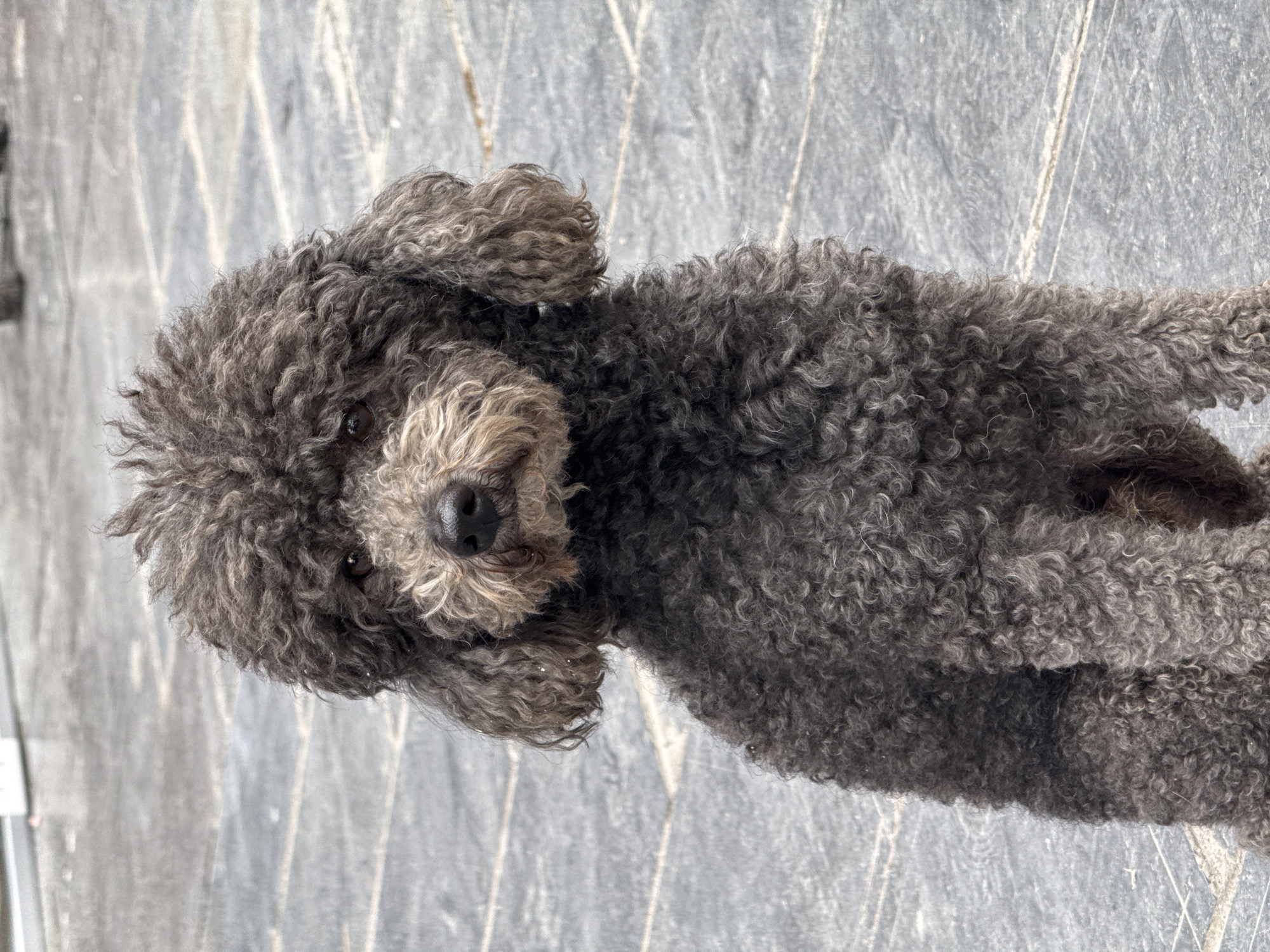- "A medium-sized dog, identified as a dark grey poodle or poodle-type breed, is depicted in a seated, upright posture, directly facing the observer" by FM-7eaFY2, licensed under CC BY 4.0