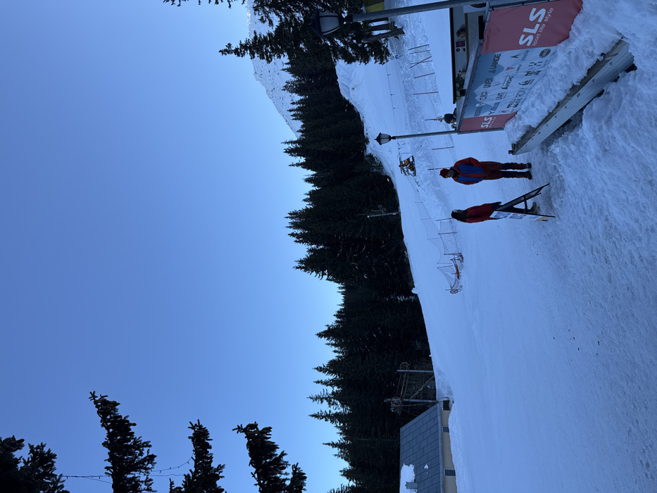 The image depicts a snow-covered mountain ski area in Bistritsa, Bulgaria, under a clear, bright blue sky. In the foreground, a snow-covered expanse serves as the ground. Two individuals stand on the snow, facing each other. The person on the left wears a red jacket and dark pants; the person on the right wears a blue and red jacket with dark pants. A dark A-frame sign with white text stands between them. To the immediate right, an outdoor kiosk or service counter with a dark counter surface is visible, featuring a banner displaying "SLS sport life style" and other brand logos. A black lamppost with a frosted glass globe top stands to the left of this kiosk. A dark coniferous tree branch with subtle string lights hangs into the upper left quadrant of the frame. In the midground, a wide, snow-covered ski slope ascends, bordered by dense coniferous trees. Orange safety netting and fencing are installed along sections of the slope. On the left side of the slope, a single-story building with a light-colored, snow-covered roof and dark walls is present, situated near visible elements of a ski lift mechanism, including metal poles and cables. Further up the slope, a small yellow structure is visible, potentially a piece of equipment or a temporary shelter. The background features a continuous line of dark green coniferous trees covering the lower slopes, leading up to a rugged, snow-capped mountain peak that dominates the upper right portion of the scene. The sky above is uniformly clear and blue, showing no clouds.