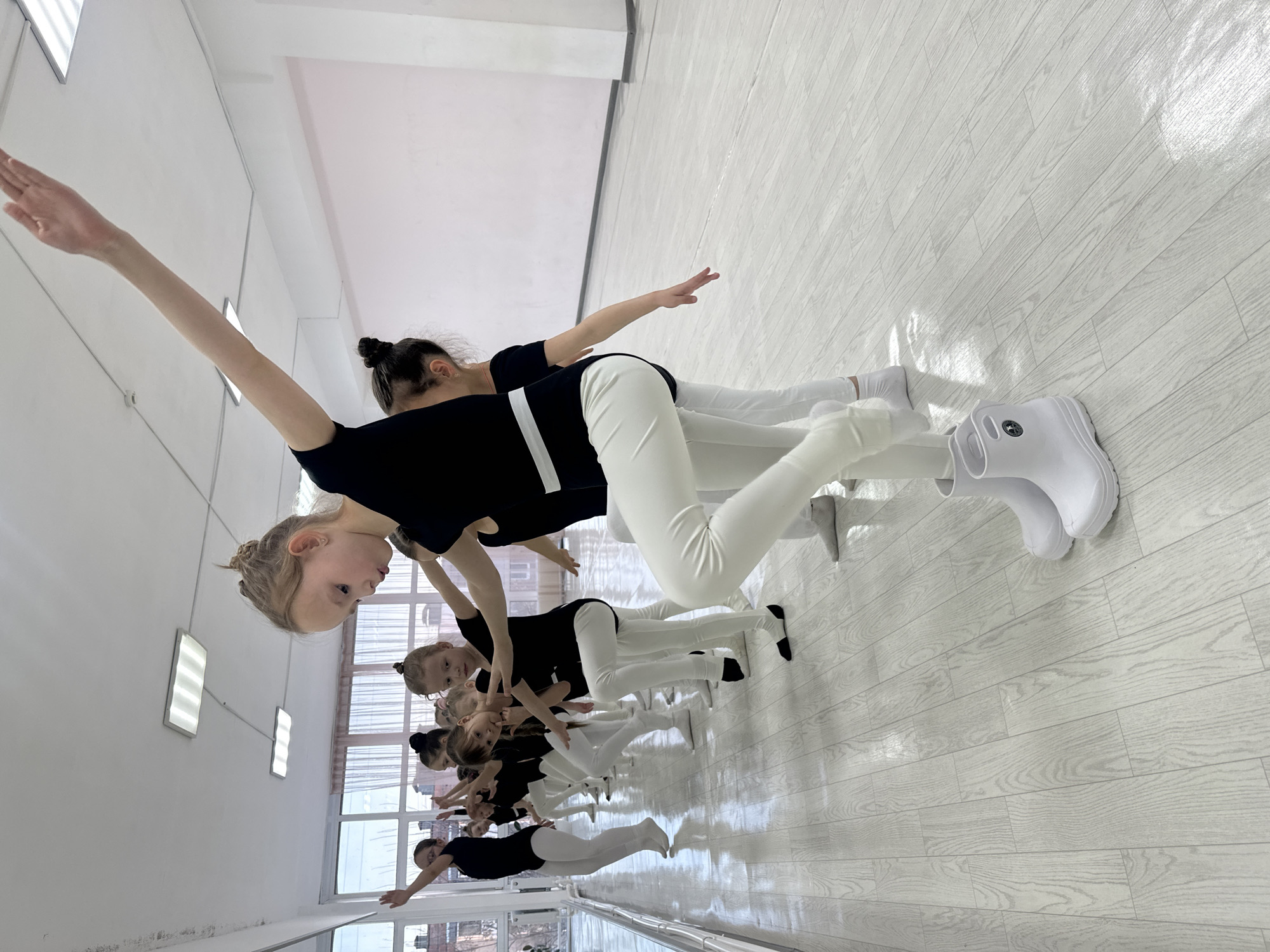 A group of about a dozen young girls are lined up in a dance studio in Votkinsk, Russia, likely for a ballet class. They wear black shirts and white leggings, and they are stretching in unison, reaching one arm overhead and the other out to the side. The studio has light-colored walls and a light wood-look floor. There is a window visible in the background. One girl in the front is wearing white rain boots.
