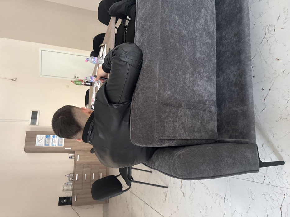An indoor scene, likely an office or meeting room, is captured from behind an individual seated on a dark grey upholstered sofa. The setting is located in Ruse, Bulgaria. The individual, observed from the rear, is male, with short hair featuring a faded undercut and a distinct V-shaped trim at the nape. He wears a black leather jacket with prominent ribbed detailing on the elbows, dark trousers, and dark sneakers. His feet are propped up on a rectangular light-colored wooden table that dominates the midground. His right forearm rests on the table, and he holds a dark-colored object, possibly a mobile phone. The table is surrounded by multiple black office chairs with metal frames. Scattered on the table surface are two transparent plastic water bottles, branded "Mihalitsa," one with a pink cap and one with a blue cap. A dark glass beverage bottle, a pair of sunglasses, and several white papers are also present on the table. The room features light beige walls and a tiled floor with a light base color interspersed with dark, irregular, crack-like patterns. Against the left wall, a tall, slender brown wooden cabinet with multiple visible shelves stands next to a wider, lower brown wooden credenza. A black coffee machine and several glass vessels are positioned on the credenza. A white interior door is visible on the right wall, above which a white electrical panel or utility box is mounted. A bare wire segment hangs from the ceiling in the upper-mid section of the frame. There are no other visible people or interactions.