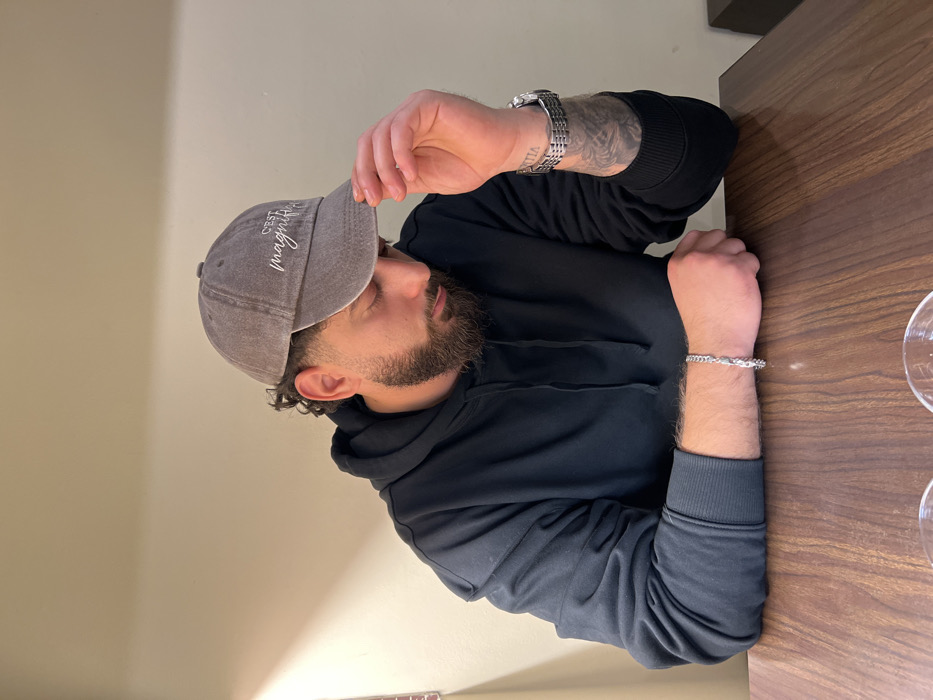 A male subject is depicted seated at a dark wooden table in an indoor establishment located in Chevilly-Larue, France. The individual wears a dark grey or black hooded sweatshirt and a faded grey baseball cap with "C'EST magnifique" embroidered in white on the front. His head is bowed, looking downwards, and his right hand is resting on the brim of the cap. He possesses a full dark beard and curly dark hair visible around his ears. A silver-toned chain bracelet is present on his left wrist. On his right wrist, a silver-toned metallic watch with a link band and a visible face featuring Roman numerals is worn, above which a dark tattoo is present on the inner forearm. Two clear glass tumblers are partially visible in the lower foreground on the table. The background consists of a plain, light-colored wall.