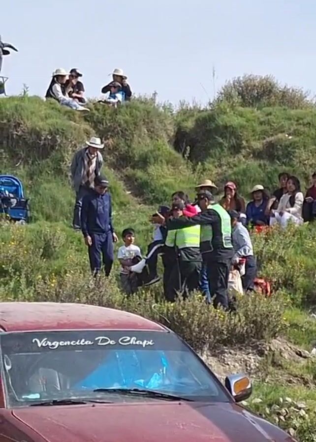 The video is shot from a low angle, showing an outdoor gathering on a grassy hillside under a partly cloudy sky. In the foreground is a maroon pickup truck with the inscription "Virgencita De Chapi" on the windshield. The hillside is populated with several groups of people, some sitting and some standing. The people are wearing a mix of casual and traditional clothing, including hats. Near the top of the hill, there's a large statue of a bull. Several individuals seem to be interacting near the center of the frame. A blue stroller is also visible on the hillside. The music has a Latin sound.