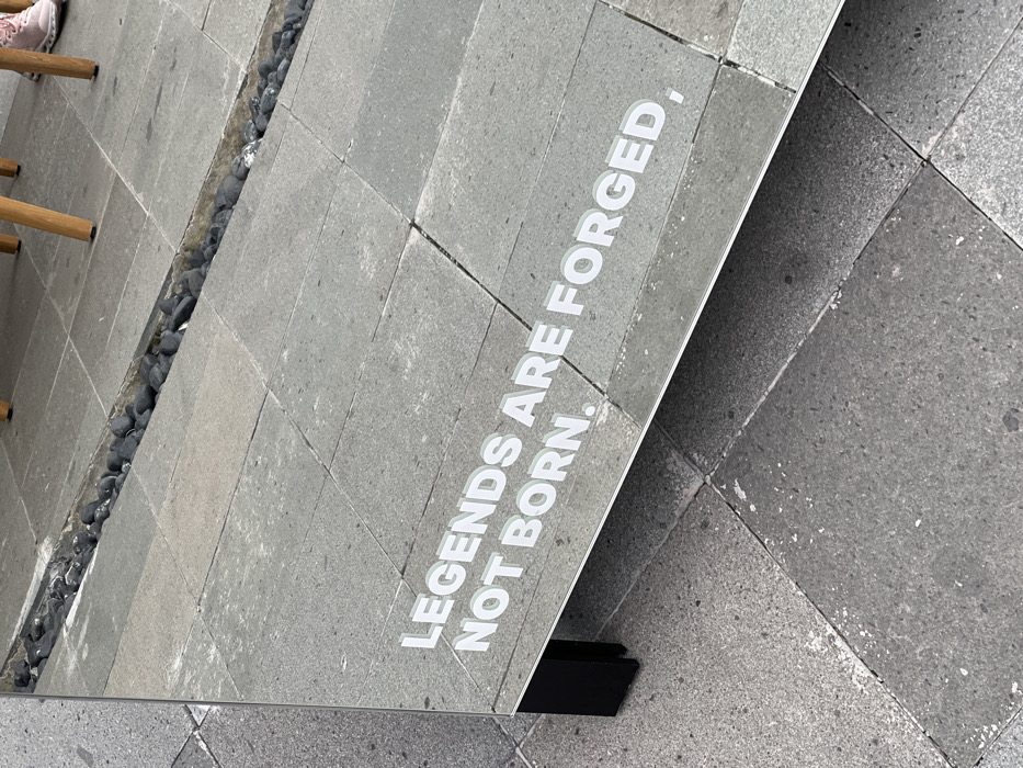 In Munggu, Indonesia, an outdoor scene features a rectangular, reflective sign positioned at an angle on grey paving stones. The sign displays the white, sans-serif text "LEGENDS ARE FORGED, NOT BORN," appearing with a slight shadow effect. A dark, angular support structure is visible at the bottom left base of the sign. The ground consists of large, light grey rectangular paving stones. A narrow strip filled with dark, smooth river stones or pebbles runs horizontally across the upper portion of the paved area. The reflective surface of the sign shows partial reflections of the surrounding environment, including additional grey paving stones, the lower sections of light-colored, possibly wooden, furniture legs, and a person's foot wearing a light pink athletic shoe with a white sole.