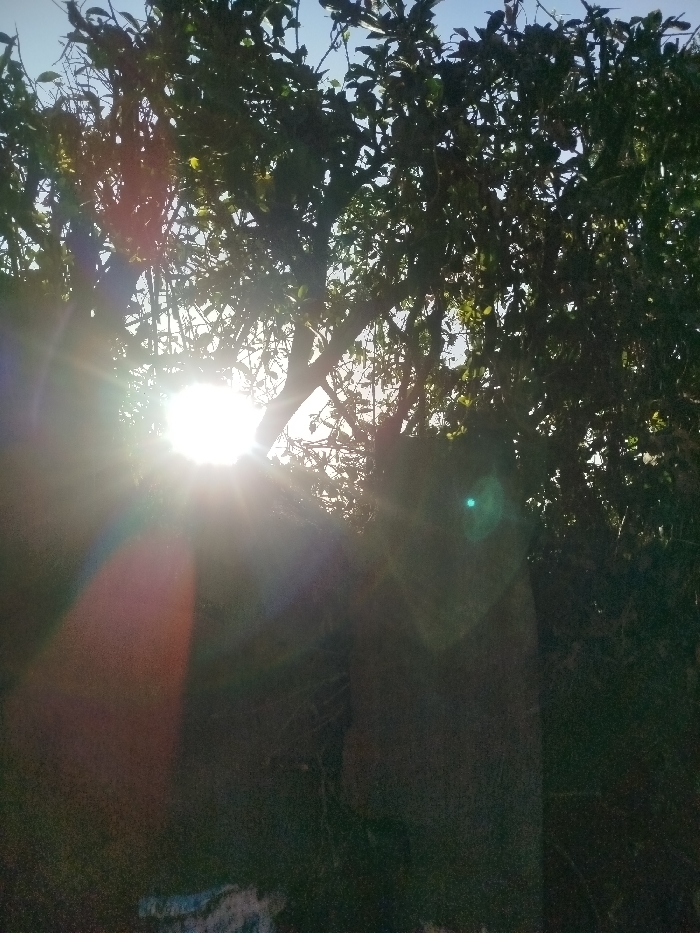 The image depicts an outdoor daytime scene in Nairobi, Kenya, characterized by a prominent tree canopy illuminated by direct sunlight. A powerful light source, presumed to be the sun, is positioned in the upper-left quadrant, causing significant lens flare with multi-colored streaks and circular artifacts across the frame. The tree's branches and dense green foliage are silhouetted against the bright light and a pale blue sky, with some leaves catching the light and appearing lighter green. The lower half of the image is heavily shadowed, appearing almost black, obscuring any discernible ground features or objects. No individuals, animals, or specific man-made structures are visible, nor are any actions or interactions discernable within the frame. The environment is natural, dominated by the tree and natural light conditions.