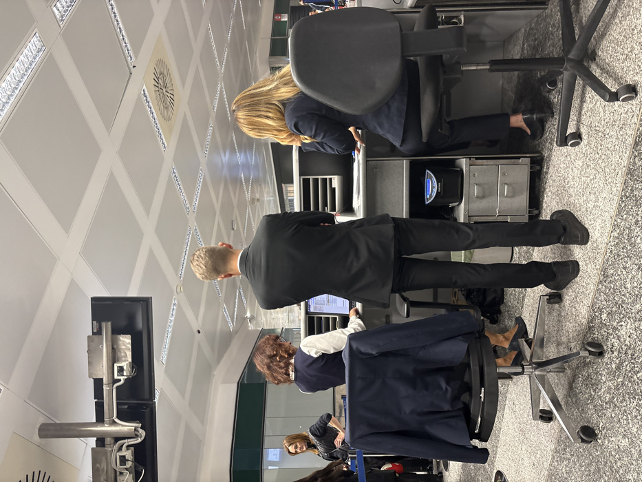 An indoor scene at Malpensa Airport (MXP) in Ferno, Italy, depicts a customer service or check-in counter area. The environment features a light-grey speckled floor and a suspended grid ceiling with numerous recessed rectangular fluorescent light fixtures and circular air vents. Overhead metal conduits are visible near the upper left. In the center, a male with short blonde hair, wearing a dark suit, stands facing away from the camera, observing the counter area. To his left, a female with curly brown hair, dressed in a white blouse and dark vest, is seated at a workstation, focused on a computer monitor. A dark blue suit jacket is draped over the back of an unoccupied black wheeled office chair next to her. To the male's right, a second female with long blonde hair, wearing a dark suit jacket, is seated at another workstation, facing away from the camera, with her right hand held to her ear, suggesting a phone call or communication. A black wheeled office chair is positioned beneath her. Between the standing male and the right-seated female, a small black label printer or similar device is visible on a lower shelf of the counter. In the left background, a third female, partially visible, stands wearing a dark jacket. The scene is brightly lit and indicates a functional, professional setting.