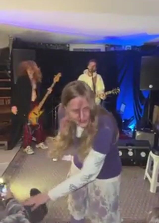 A young woman with long blonde hair dances in front of a small stage while a three-member band plays. The band consists of a man on lead guitar, a man on bass, and a drummer. They are playing to a small audience on a rug, under dim blue and yellow lights. The backdrop to the stage is made of black material.