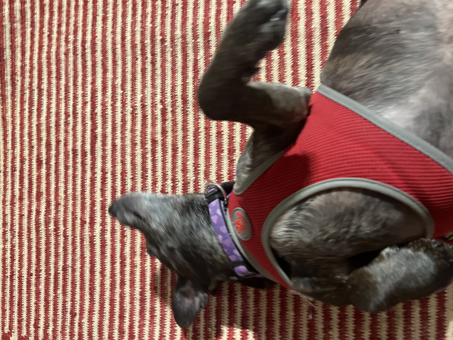 A brindle dog is lying on its back on a red and tan striped rug. The dog is wearing a red harness with a gray trim, and a purple collar with a heart pattern. The dog's head is to the left, and its legs are up in the air. The photo appears to be taken from directly above.