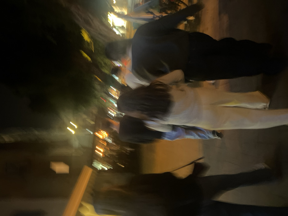 An urban street scene at night in Tel Aviv, Israel, is depicted with significant motion blur. Approximately five individuals are observed from behind, walking away from the viewer on a paved surface. Clothing details include dark tops and pants on figures to the left and right, with a central individual wearing a light-colored top and pants and having long dark hair. Blurred streaks of orange and yellow artificial light from streetlights or establishments illuminate the background. Faint building outlines are on the left, and trees or foliage are on the right. A distinct blue and white object, consistent with an Israeli flag, is partially visible on the far right.