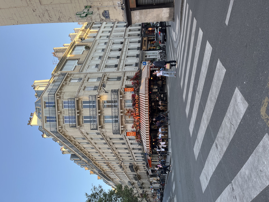 street corner in Issy-les-Moulineaux, France, at the intersection of Rue d'Alsace and Rue de Verdun. The scene is dominated by a large building with a bright orange awning. The building has numerous balconies and windows, and the street is lined with parked cars. The awning reads "LE NEMROD," indicating a restaurant or cafe. There are several people on the sidewalk and in the street, including a couple in the crosswalk. The street is paved with asphalt and has a pedestrian crossing. There are several trees visible in the background. The sky is blue and clear.
