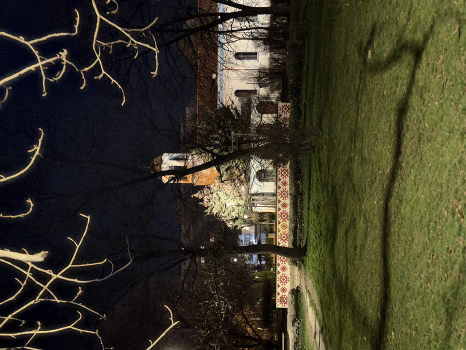 The image depicts a night scene of the Church of Sveti Sedmochislenitsi (Seven Saints Church) in central Sofia, Bulgaria, viewed from an adjacent park. The foreground consists of dark green grass illuminated by artificial light, casting long shadows. A narrow, unpaved path is visible on the left. In the mid-ground, a low wall adorned with a repetitive traditional Bulgarian folk pattern in red, yellow, and white geometric motifs horizontally spans the frame. Several bare deciduous trees, some with visible branches in the upper frame, partially obstruct the view of the church. The main subject, the Church of Sveti Sedmochislenitsi, occupies the background. It features a light-colored or white facade with arched windows and a prominent reddish-brown tiled roof. To the left, its distinct bell tower rises, partially illuminated with an orange-yellow glow on one side, featuring an octagonal upper section and a dark cupola. Evergreen trees are visible near the church structure. The dark night sky serves as the backdrop. No individuals are present.