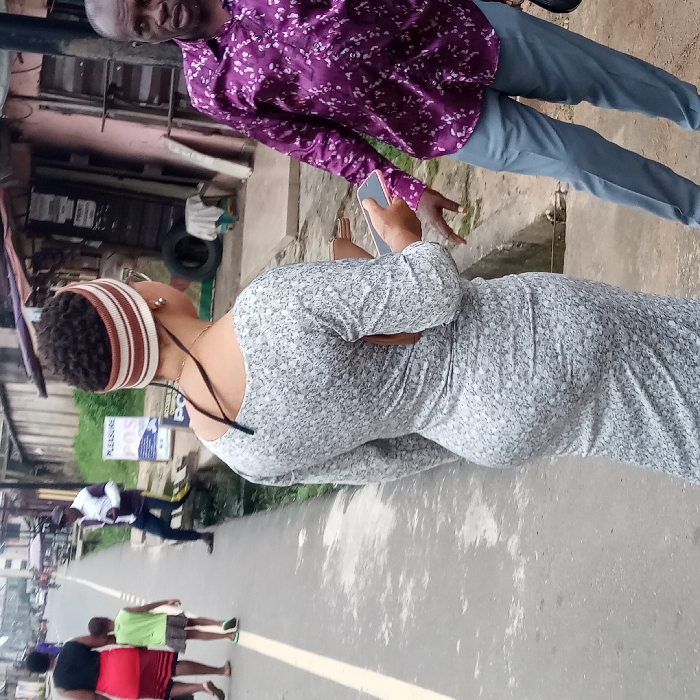 A woman with a striped headband, wearing a floral-patterned dress, stands on a street looking to her left. An older man in a purple shirt and gray pants stands partially in the frame above her, holding a phone. In the background, other people walk on the side of the street, and buildings and a parked tire are visible. The photograph appears to be taken outdoors on a cloudy day.