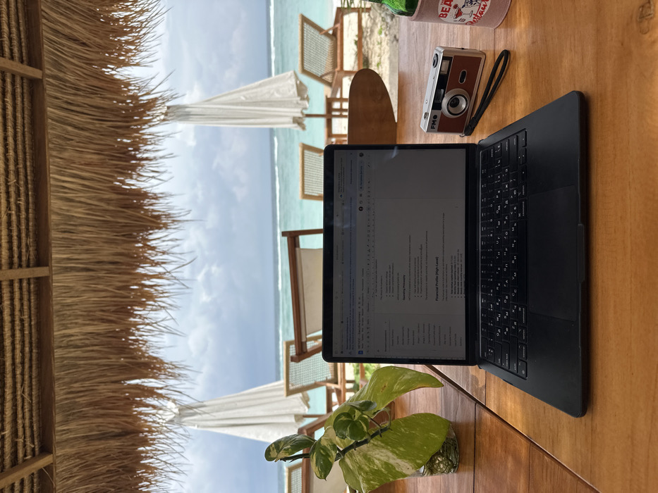 - "An eye-level shot shows a laptop open on a wooden table under a thatched roof, with a view of a tropical beach and ocean in the background" by FM-tawOm1, licensed under CC BY 4.0