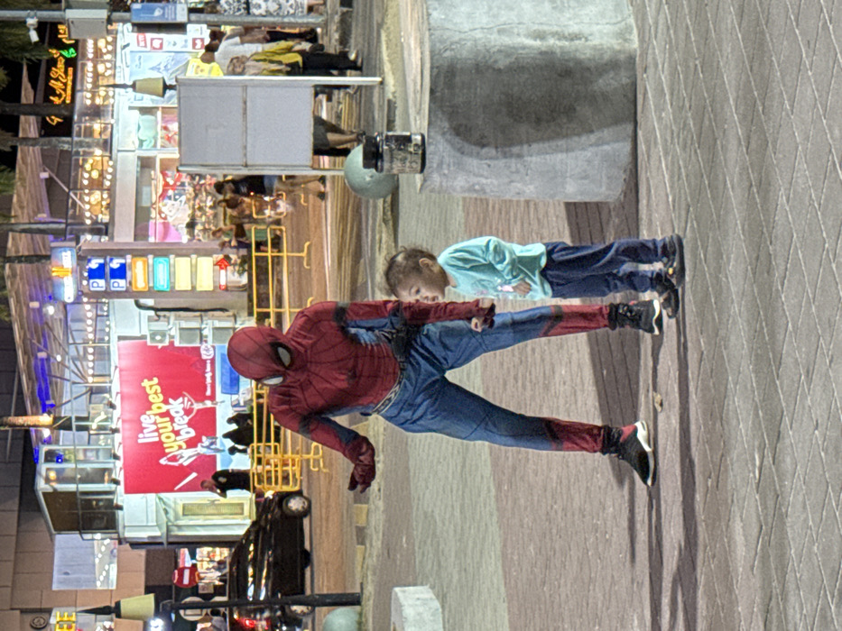 The scene depicts a nighttime urban environment, identified as Cenang Beach, Malaysia, characterized by artificial lighting. In the foreground, a person costumed as Spider-Man stands to the left of a young child. The Spider-Man costume is red and blue, covering the entire body, including a mask, with black athletic shoes. The figure's right hand is open, palm up, extended towards the child, while the left arm is bent. To the right of Spider-Man, a toddler-aged child stands, wearing a light blue long-sleeved shirt, dark blue pants, and dark sandals. The child faces right, away from Spider-Man, with an open mouth and hands loosely clasped in front. The ground is paved with light-colored interlocking bricks. On the far right, a grey concrete block supports a dark bottle or container. In the background, a busy street and commercial area are visible. A black vehicle is partially seen on the left. A prominent red LED billboard displays "live your best break" in white text. Multiple storefronts, glowing signs, and streetlights illuminate the background. Yellow crowd control barriers are positioned along the street. Several blurred figures of pedestrians are present in the distance.