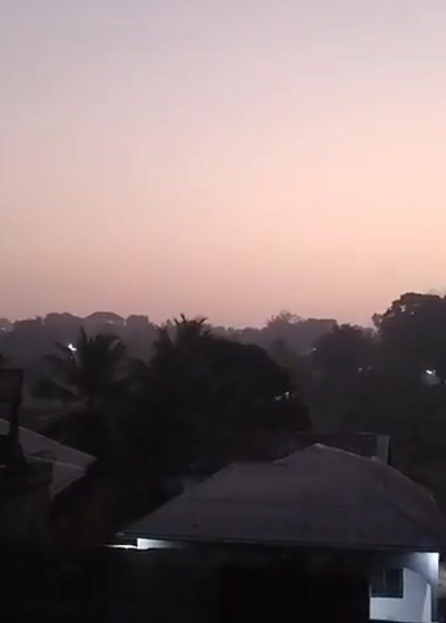 neighborhood scene at dusk or dawn. A group of buildings with roofs of various materials is visible in the foreground. Beyond the buildings are trees of different varieties, including palm trees. There is a misty or hazy atmosphere, and the sky is a blend of light gray and faint pink, indicating sunrise or sunset. There are a few lights visible among the trees.