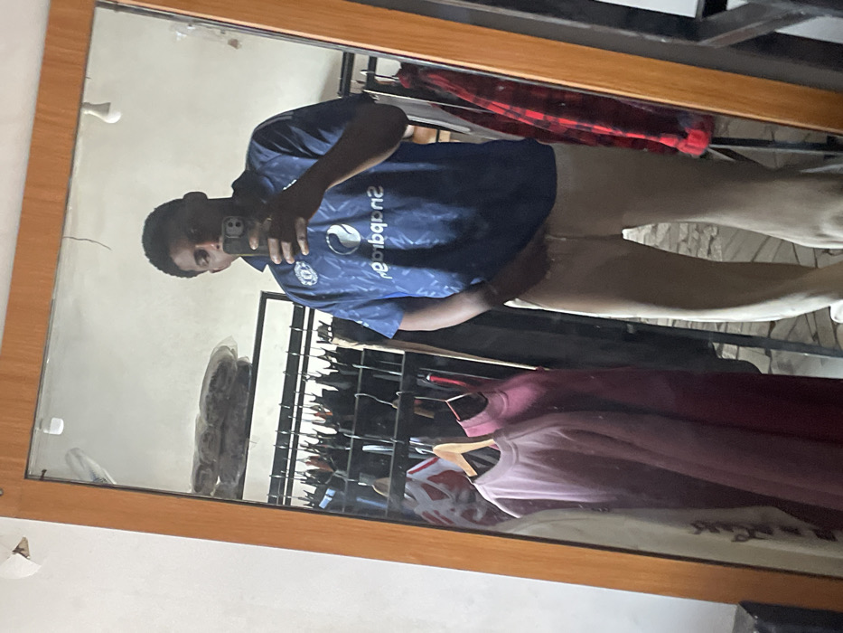 A selfie is taken in a mirror. The person is wearing a blue, patterned shirt and tan pants. A clothing rack is visible in the mirror behind the person. There are several hanging garments, including red plaid and pink and maroon sweatshirts. The mirror has a brown wooden frame. The image is rotated counter-clockwise.