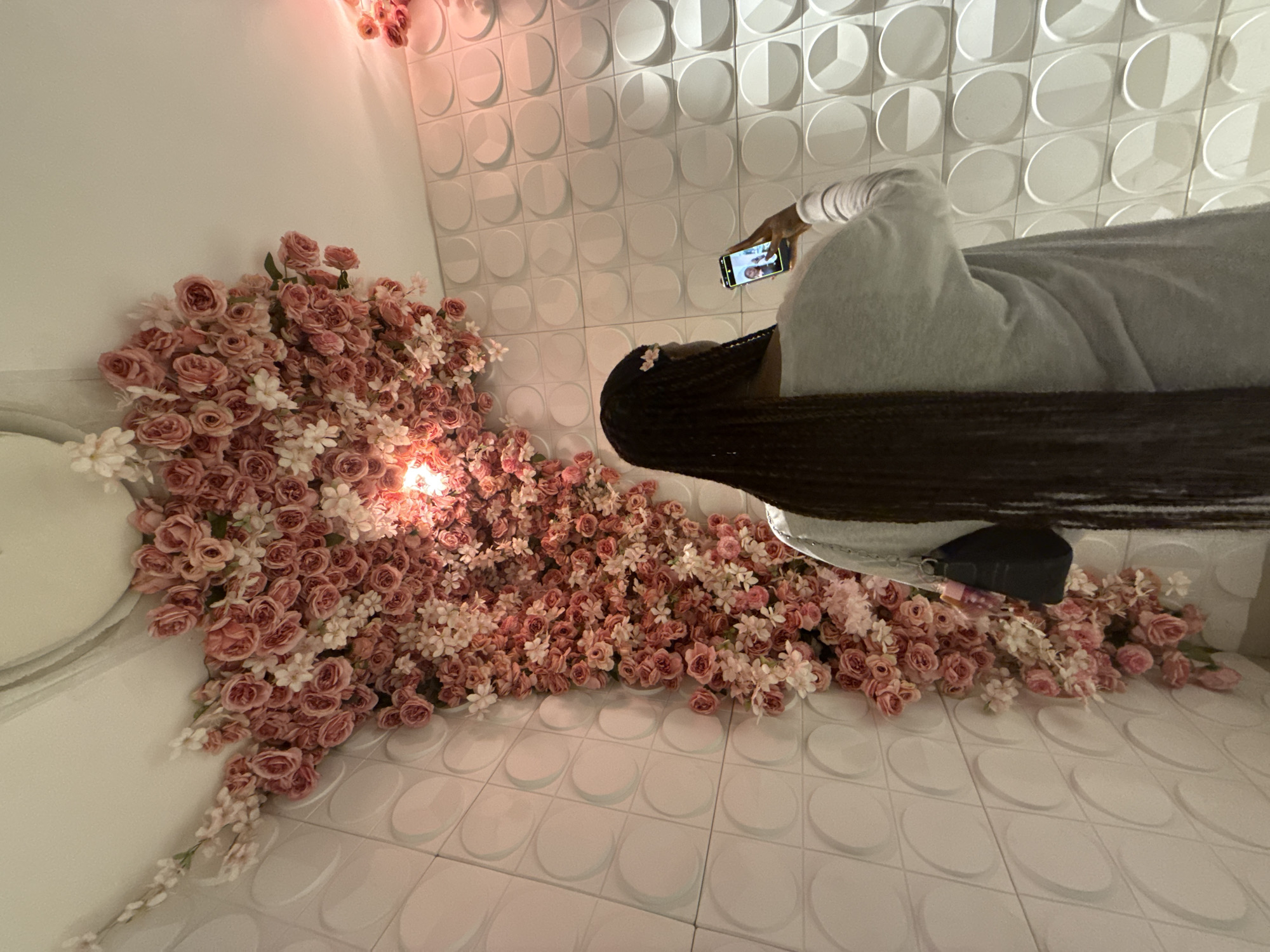 A person with long braids is taking a photograph with a smartphone in a room with white walls and tiles. The walls have a distinctive circular pattern. A large floral arrangement of pink and white flowers is present in the room. The exact location in Abuja, Nigeria, cannot be determined from the image.