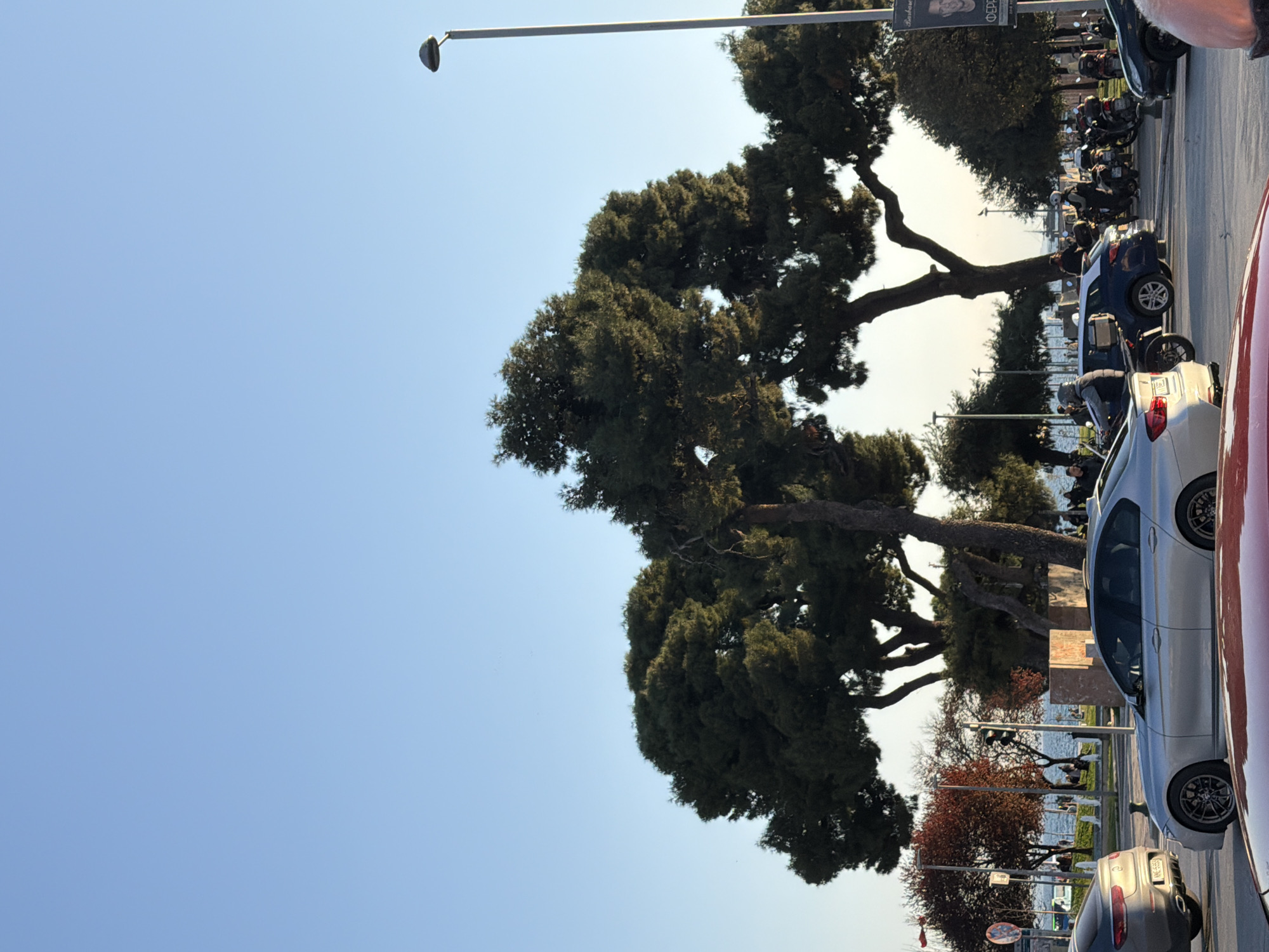 The image presents a daytime scene from the Nea Paralia waterfront in Thessaloniki Municipal Unit, Greece, viewed from street level looking towards the sea. The sky is clear and light blue, occupying the upper third of the frame. In the immediate foreground, the top of a red vehicle is partially visible at the bottom center. The midground features an asphalt road with active and parked vehicles. A silver sedan, likely a BMW, is prominent on the right, facing away from the viewer. To its left, a gray Mercedes SUV is partially visible, also facing away. Further back, a blue hatchback is visible. On the right side of the road, a cluster of motorcycles and scooters are parked. A tall, silver street lamp pole stands on the far right. Beyond the road lies a promenade area densely populated with mature evergreen trees, characterized by dark green foliage and thick, dark brown trunks. Several deciduous trees with reddish-brown leaves are interspersed among them. Numerous individuals are visible walking and standing along the promenade. White, geometric structures, potentially decorative elements or seating, are visible near the waterfront. The background reveals the calm, light blue expanse of the sea. On the far left, multiple traffic signs, including a red circular "No Entry" sign and a blue square directional sign, are visible alongside a traffic signal. On the far right, a vertical poster attached to a pole displays a man's face and partially legible text, including "Barbara" and "FERRY".