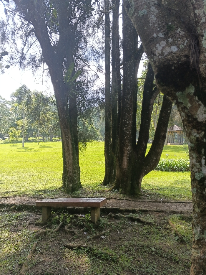 - "A tranquil park scene features a weathered wooden bench situated amidst a grove of tall trees" by FM-RJkRR2, licensed under CC BY 4.0