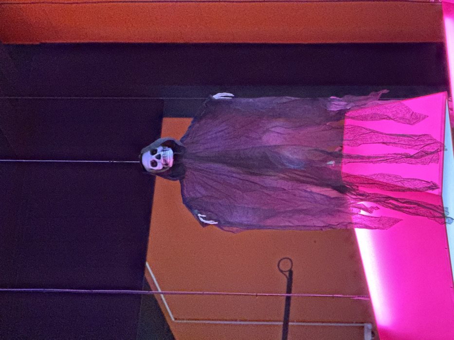 The scene, located in Reichstett, France, depicts an indoor environment featuring a Halloween decoration