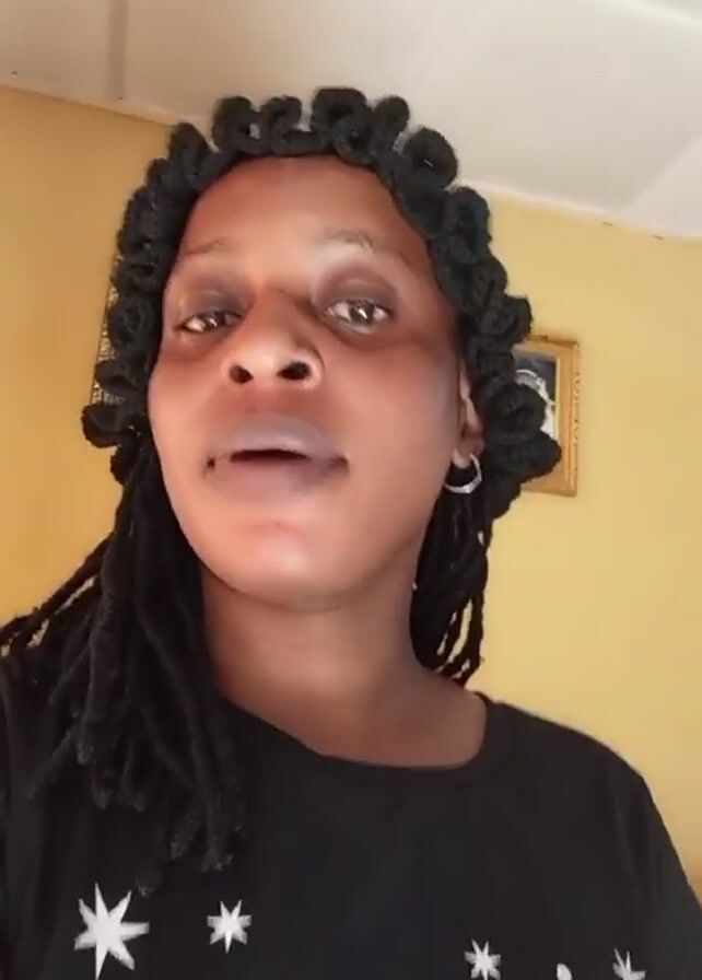 A woman with dark skin and dark dreadlocks stands facing the camera in front of a yellow wall. Her hair is arranged with some dreadlocks framing her face, and the top dreadlocks are twisted into small loops around her head. She wears small hoop earrings and a black t-shirt with white star designs and red text reading "GET YOUR". A framed picture hangs on the wall behind her. She looks directly at the camera and smiles slightly. The camera remains relatively steady throughout the short clip.