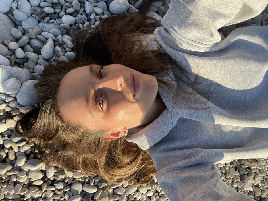 A female subject is observed in a high-angle view, lying supine on a pebble beach in Drobnići, Montenegro. Her head is positioned towards the upper portion of the frame, with her long, wavy, brown hair fanned out across the light grey and white, rounded pebbles. She is wearing a light grey hooded sweatshirt. Her face is oriented directly towards the camera, with direct sunlight illuminating the upper-left side (viewer's right) and casting a distinct shadow across the lower-right side (viewer's left) of her face. Her green eyes are open, and her lips form a subtle smile. A small, light-colored stud earring is present in her visible left earlobe. The entire background is composed of smooth, naturally occurring pebbles of varying sizes. The scene is outdoors, with lighting conditions consistent with a low sun angle.