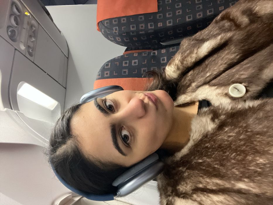 A woman wearing over-ear blue headphones and a brown fur coat sits on an airplane. The seat behind her has a square patterned upholstery in black, orange, and navy. Above her, on the plane's ceiling, are controls for the light and air conditioning. The cabin interior appears clean and modern. The woman gazes into the camera with a slightly tilted head.