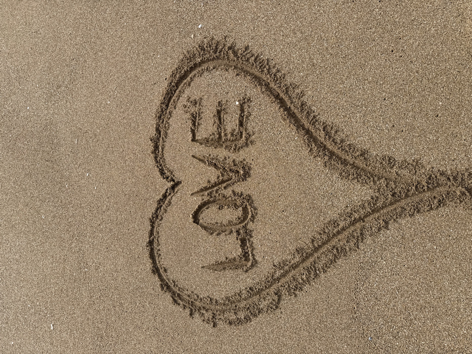 The image provides a detailed, top-down perspective of a light brown, fine-grained sandy surface, consistent with a beach environment in Bourail, France. Prominently featured in the center is a heart-shaped outline, approximately 25cm in width, deeply inscribed into the sand. Within this heart, the word "LOVE" is spelled out in four capital letters, each approximately 5cm in height, also inscribed into the sand. Both the heart's perimeter and the letters are visible as darker depressions, roughly 1cm deep, contrasting with the lighter, undisturbed surrounding sand. The sand exhibits a uniform texture and minimal moisture. There are no individuals, other objects, or further environmental features visible within the frame.