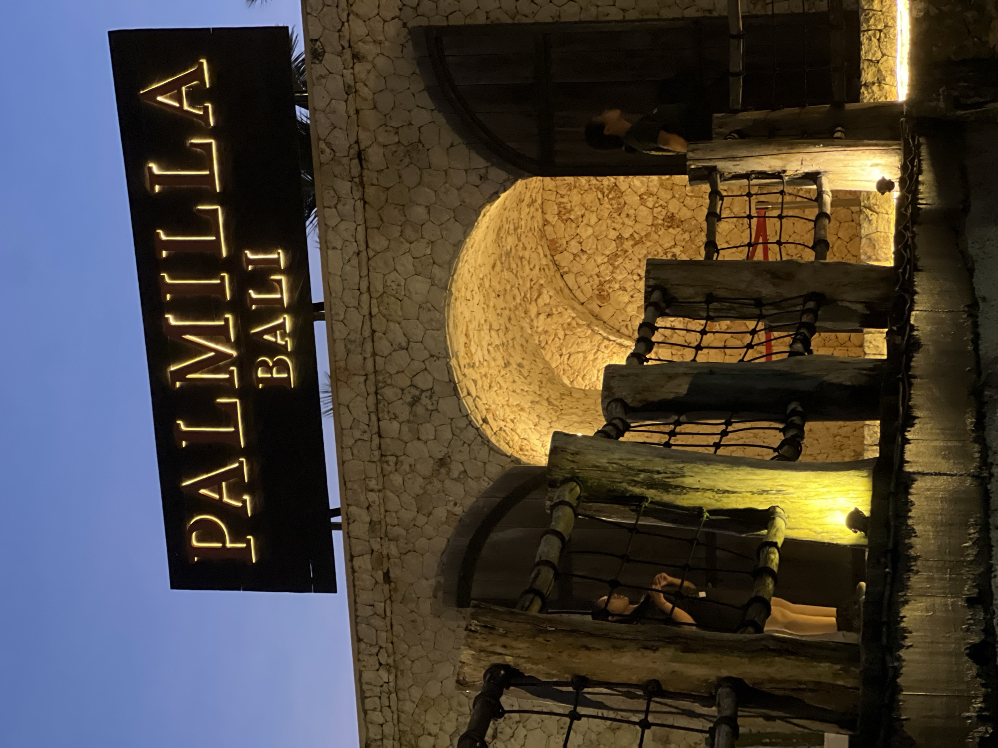 The image depicts the exterior of "Palmilla Bali" in Ungasan, Indonesia, at dusk. A stone building features arched openings with wooden framework and rope netting. People are visible in the openings. The "Palmilla Bali" sign is illuminated.
