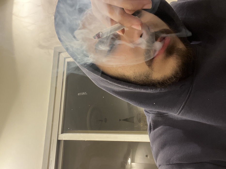 A person wearing a dark hoodie is seen smoking a cigarette. The face is partially obscured by smoke. The individual has a beard. A window is visible in the background, revealing interior elements such as a chandelier. The overall perspective is from a slightly downward angle.