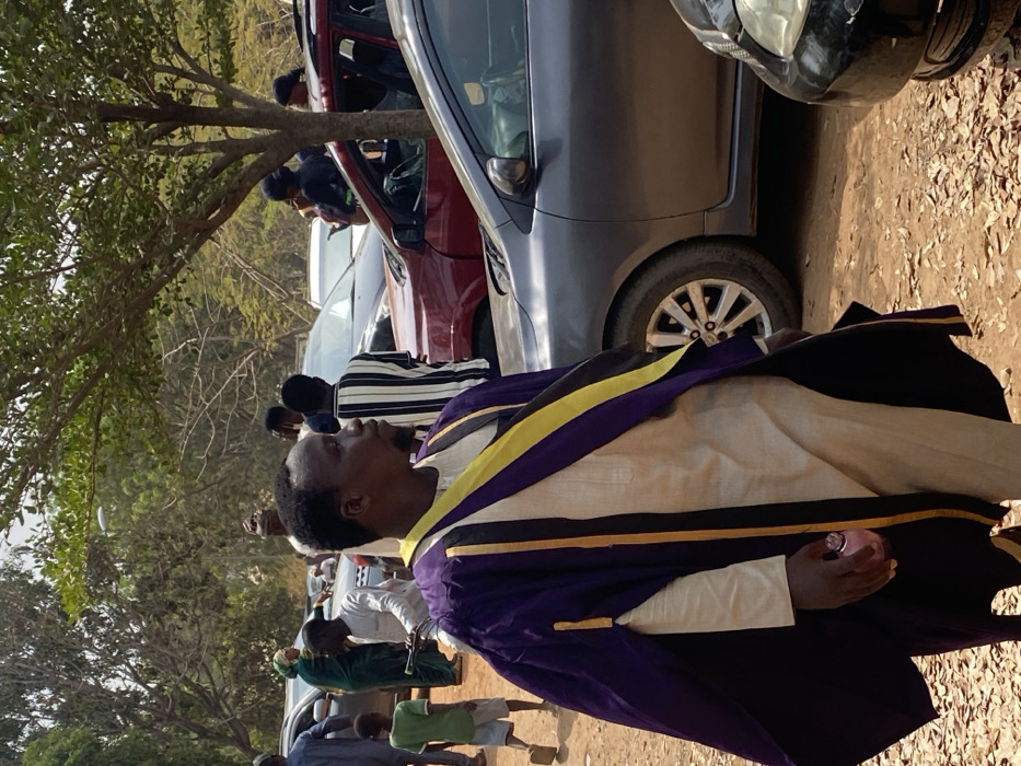 The image captures an outdoor scene in Barako, Nigeria, under bright daylight conditions. In the immediate foreground, an adult male with dark skin and short dark hair is depicted from the mid-torso upward, facing right and looking slightly ahead and upward. He is wearing a prominent purple academic gown with black trim and a yellow and black academic stole draped over a light beige traditional Nigerian garment. His right hand holds a small, light pink, cylindrical object. The midground is densely populated with parked automobiles and multiple individuals. Vehicles present include silver, red, and black sedans and possibly SUVs. The ground consists of reddish-brown dirt, extensively covered with dry, fallen leaves. Several people are visible standing or moving amongst the vehicles. On the far left, a young boy in a green t-shirt and light shorts walks away from the viewer. Further back on the left, a woman in a dark green dress and head covering stands near a silver car. Another male in a vertical black and white striped shirt is partially visible behind the central figure. The background consists of additional parked vehicles and indistinct figures, partially obscured by the sparse foliage of multiple deciduous trees under a clear, bright sky. The overall impression is an outdoor gathering or event in a makeshift parking area.