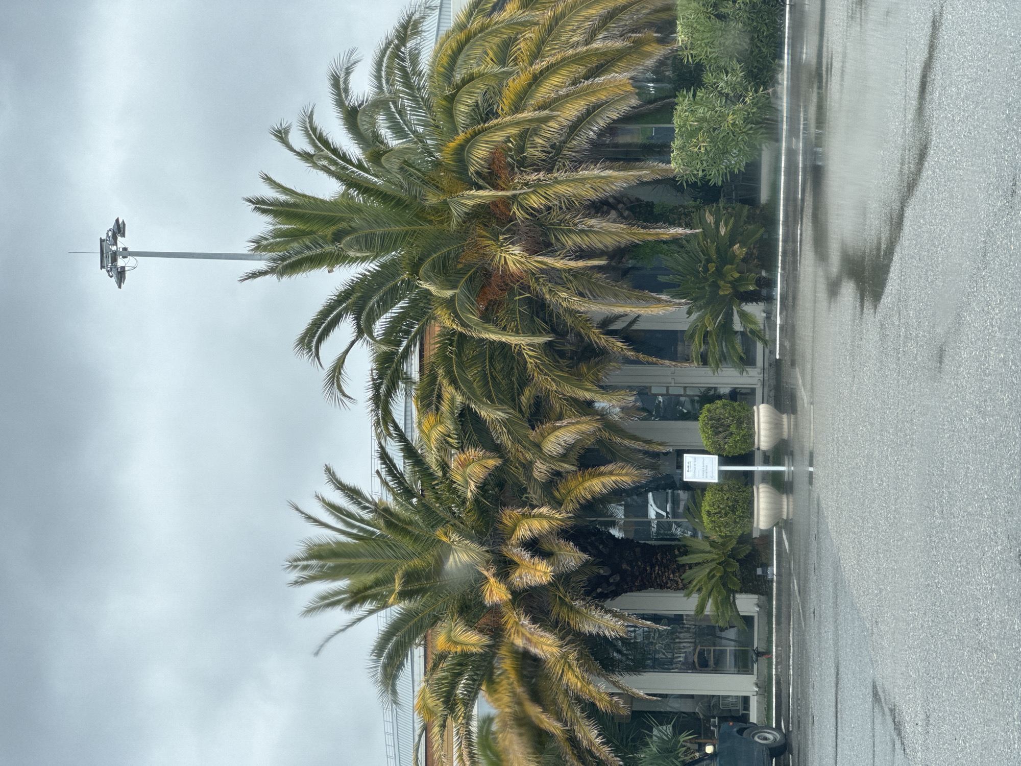 The image depicts a street scene on a rainy day. The foreground is dominated by a wet asphalt surface, reflecting the sky and surrounding buildings. The background features a building with glass windows and doors. Two palm trees are prominently positioned in front of the building, their fronds displaying a mix of green and yellow hues. A tall metal pole with multiple lights or cameras is visible in the distance. The sky is overcast and grey. The location is presumed to be in the city of Sirius, Russia, based on the prompt. A car is visible in the lower-right corner of the image. Bushes or small trees are planted in decorative planters in front of the building. A sign with text is posted in front of the building.