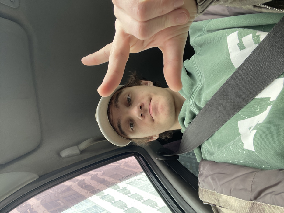 A young male, appearing to be in his late teens or early twenties, is seated as a passenger inside a vehicle, indicated by a dark grey seatbelt diagonally across his chest