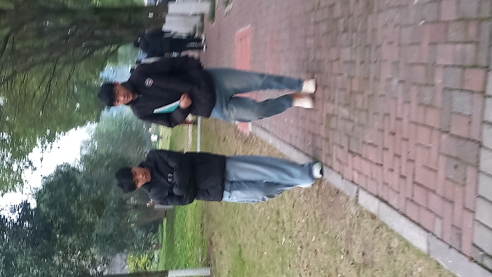Two men in dark jackets and jeans stand on a path. They appear to be on a college campus or a park. One is holding a notebook. The path is made of brick and is bordered by a grassy area with trees. There are other people in the background.