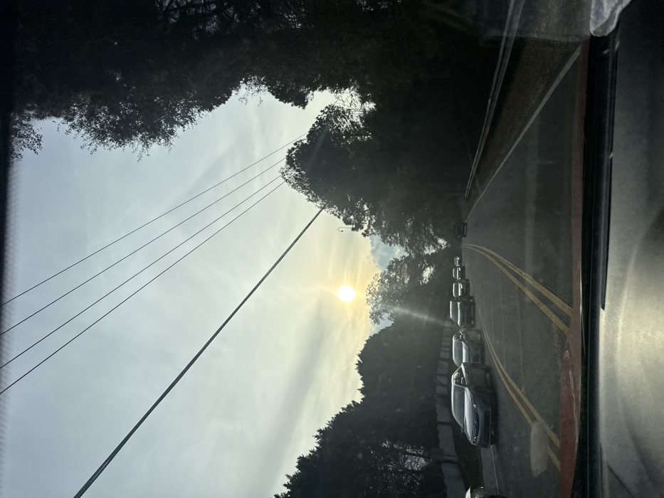 A view from inside a car, looking out onto a tree-lined road with a line of parked cars. The sun shines brightly in the sky, creating a hazy effect. Power lines stretch across the sky. The road has double yellow lines. Dark trees frame the top and bottom of the view.