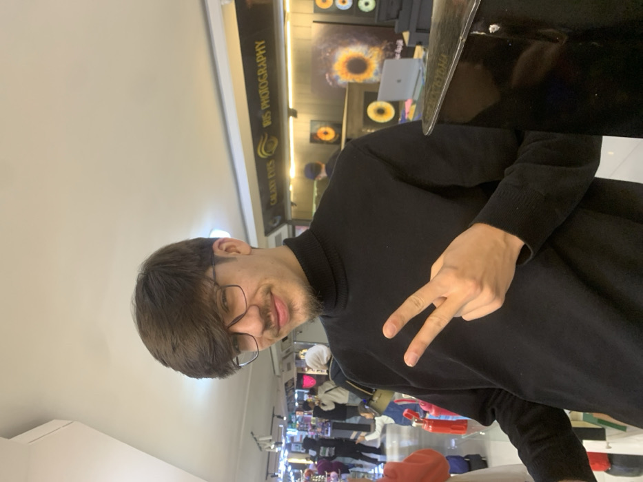 A man with glasses and dark hair, wearing a black turtleneck sweater, poses with a peace sign. He appears to be in a store, with other shoppers visible in the background. Behind him, illuminated signs and displays feature images resembling galaxy-themed donuts and a laptop. The overall scene is brightly lit, suggesting a retail environment.