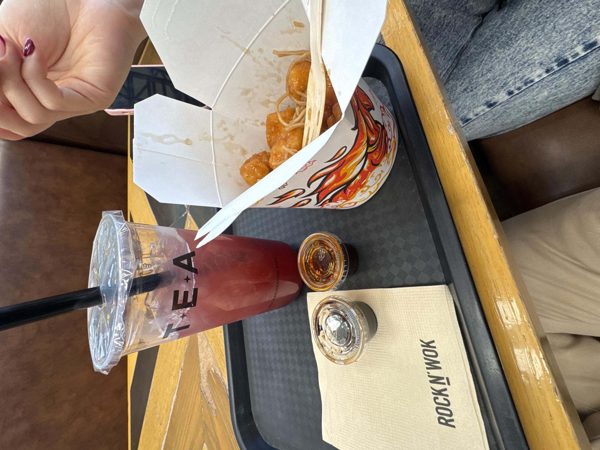 A black plastic tray is centrally positioned on a wooden table, occupied by a meal in what appears to be a fast-casual dining setting within a commercial center in Puebla, Mexico, likely a food court such as those found in Centro Comercial Angelópolis or Parque Puebla. On the tray, a clear plastic cup filled with a reddish-pink iced beverage and a black straw is visible on the left. The cup is labeled "T E A" and "TEA EXPLORATION AREA." To its right, an open white cardboard takeout box with a red and orange flame graphic contains several orange-coated, spherical food items (likely chicken or similar protein) mixed with thin noodles, accompanied by a light-colored wooden spork. Below the beverage cup, a beige paper napkin displays the "ROCK N' WOK" logo in black. Adjacent to the napkin are two small, clear plastic condiment cups with lids: one containing a dark, thick sauce, and the other an orange-brown, oily sauce. In the upper right quadrant, a fair-skinned hand with dark red/burgundy polished fingernails is partially visible. Below the table, the legs of two individuals are visible: one wearing blue denim jeans and the other wearing light brown/beige trousers, suggesting at least two patrons are present. The background features a blurred brown upholstered surface, consistent with booth seating. A pink mobile phone with a black case is partially visible behind the hand.
